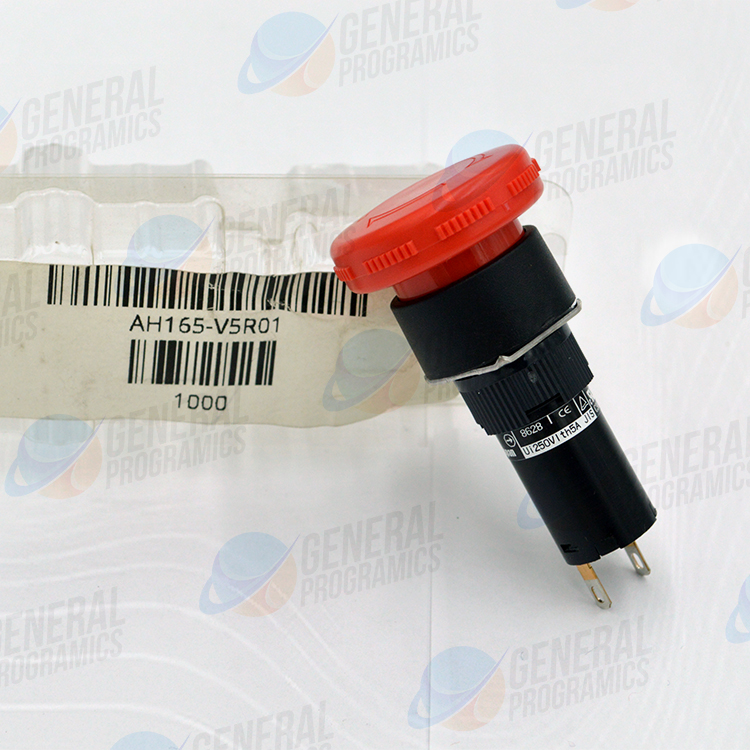 El AH165-V5R01 es un botón de paro de emergencia (E-Stop) de la serie AH165 de Fuji Electric.